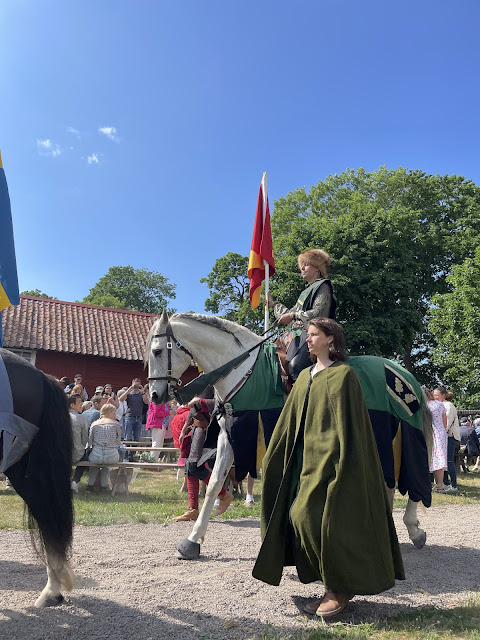 Festklänningar och finkläder. Blomsterkransar och midsommarstång på vår lilla stads Kvarngård.